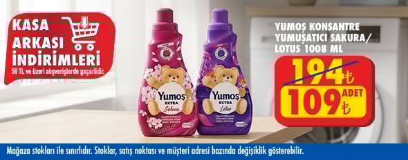 50 TL ve üzeri alışverişinize Yumoş Konsantre Yumuşatıcı Lilyum 1008 Ml , Yumoş Extra Yabani Orkide 1008 Ml , Yumoş Extra Şakayık 1008 Ml , Yumoş Extra Yumuşatıcı Lotus 1008 Ml , Yumoş Extra Sakura Çamaşır Yumuşatıcısı 1008 Ml 109.00 TL!