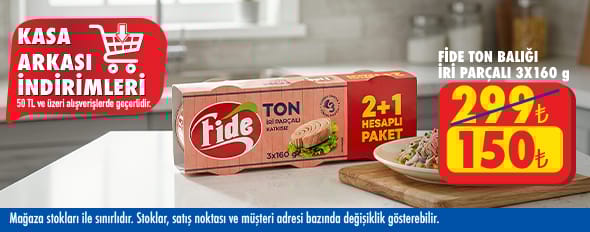 50 TL ve üzeri alışverişinize Fide İri Parçalı Ton Balığı 3*160 G 150.00 TL!