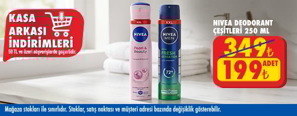 50 TL ve üzeri alışverişinize Nivea Men Fresh Sensation Deodorant 250 Ml , Nivea Pearl&Beauty Deodorant 250 Ml 199.00 TL!