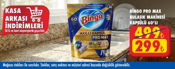 50 TL ve üzeri alışverişinize Bingo Akıllı Bulaşık Kapsülü Pro Max 60'lı 299.00 TL!