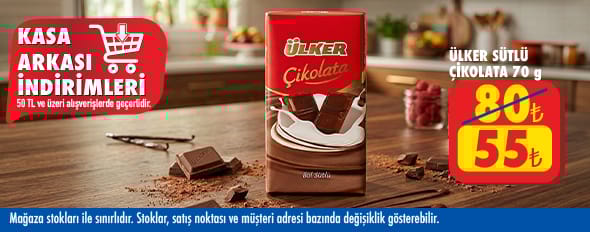 50 TL ve üzeri alışverişinize Ülker Sütlü Çikolata 70 g 55.00 TL!