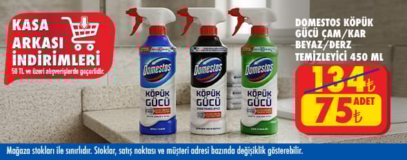 50 TL ve üzeri alışverişinize Domestos Köpük Gücü Derz Temizleyici 450 Ml , Domestos Köpük Gücü Beyaz Sabun 450 Ml , Domestos Köpük Gücü Çamaşır Suyu Çam 450 Ml 75.00 TL!