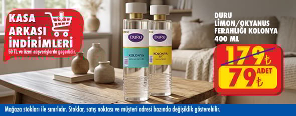 50 TL ve üzeri alışverişinize Duru Okyanus Ferahlığı Kolonya 400 Ml , Duru Limon Çiçeği Kolonya 400 Ml 79.00 TL!