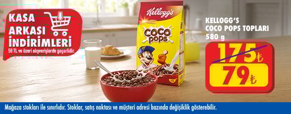 50 TL ve üzeri alışverişinize Kellogg's Coco Pops Kakaolu Mısır ve Buğday Gevreği 580 g 79.00 TL!