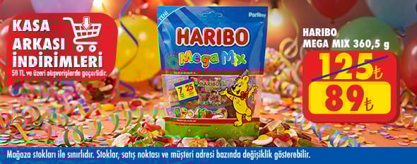50 TL ve üzeri alışverişinize Haribo Mega Mix 360 g 89.00 TL!
