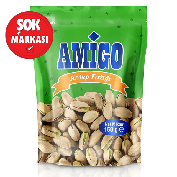 Saymakla bitmeyen yararlı etkileri, dilden dile yayılan eşsiz tadı ve özellikle tatlıların olmazsa olmazı Amigo Antep Fıstığı, ŞOK Market raflarında yer almakta ve güvenle tercih edilmektedir. Yüksek besin değerleriyle ön plana çıkan, özellikle şerbetli tatlıların yıldızı Antep fıstığı, başta Anadolu bölgesi olmak üzere hemen hemen her mutfakta kendine yer bulmaktadır. Alerjen Uyarısı: Ürün içerisinde Antep fıstığı ve tuz yer almaktadır. Ayrıca içerisinde eser miktarda diğer sert kabuklu meyveler, gluten ve yer fıstığı yer alabilir. Amigo Antep Fıstığının güneş ışığından uzak, serin, kokusuz ve kuru yerlerde muhafaza edilerek saklanması önerilir.